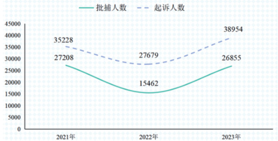 图 1 检查机关受理逮捕、起诉未成年犯罪嫌疑人数 ( 图片来源于《未成年人检察工作白皮书(2023)》)