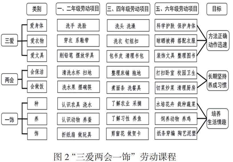 (2)能力提升课程:聚焦“兴趣引路”,驱动主动探索与素养融合,利用学生的好奇心与真实需求,激发内生动力,驱动跨领域学习与能力整合。在“双减”背景下,构建菜单式多元课后服务体系,成立涵盖科技、艺术、体育、人文、劳动等领域的多种兴趣社团,实行走班制,满足学生个性化成长需求;深度开发“小三爱 + ”主题课程群(如《“三爱两会一饰”》劳动课程,图2)。围绕“爱人、爱物、爱集体”主线,设计差异化、项目化的实践活动。兴趣社团和主题课程群并非单一技能训练场,“小三爱 +i ”劳动课程必然融合动手实践(劳育)、问题解决(智育)、协作沟通(德育)、作品设计(美育)等。学生在兴趣驱动下,主动将不同领域的知识、技能、情感态度围绕“小三爱”主题进行深度整合与应用,实现五育目标在真实问题解决中的自然融合与能力提升。