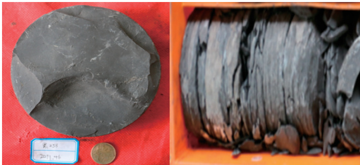通过观察 H258 井、H238 井、TY1 井和 CH34-7 井的油页岩岩心,结合前人对松辽盆地油页岩的描述,可知松辽盆地南部地区青一段油页岩颜色以灰黑色、深灰色和灰褐色为主(图1-图2)。主要为泥质结构,发育水平层理以及少量的块状层理,可见介形虫、壳类化石和生物碎屑化石、黄铁矿、灰白色白云岩透镜体及薄层;偶见粉砂质条带及薄层。油页岩的裂缝较为发育,常常被后期形成的方解石脉充填[2]。