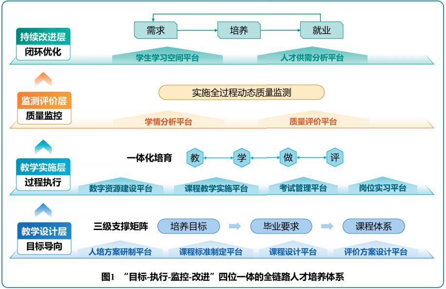 基于成果导向教育(OBE)理念,本研究构建 " 目标 - 执行 - 监控 - 改进 " 四位一体的全链路人才培养体系(如图 1 所示),该体系是对人才培养全生命周期的4 大流程(教学设计、实施、评价、改进)、12 个人才培养工作场景的流程、制度、运行体系的深层次革命,也就是把人才培养方案研制平台、课程标准制定平台、课程设计平台、评价方案设计平台、校本资源库平台、课程教学平台、考试管理平台、岗位实习平台、学情分析平台、质量评价平台、学生学习空间、人才供需平台等 12 个统一集成为一个大平台,实现基于成果导向范式的数字化全链路人才培养。