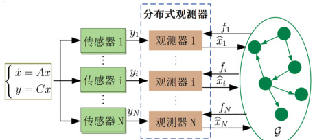 状态估计(state estimation)是控制理论与应用中的一个经典、重要的主题 [1,2] ,其主要针对系统状态难以获取甚至无法获取的系统。在这种情况下,可以通过构建观测器来实现对目标系统状态变量的估计 [1,2] ,进而,找出使得观测器的状态变量与目标系统状态变量之间的误差随着时间趋向于无穷大而收敛到零的条件 [1-3 。经典的观测器理论主要是实现观测器与系统状态之间的“一对一”的估计,即用一个传感器来实施对目标系统完整输出信息的测量,进而在此输出信息的基础上,设计一个观测器来实现对目标系统完整状态的估计,例如文献 ⌊1-4- ]。然而,实际工程中存在很多“区域性”的目标系统 [5],如大型生产车间、灌溉系统、太阳能田、原油泄漏及扩散 区域、城市供水系统,这类目标系统占据着地理上的大范围区域。由于单个传感器功能简单,处理场景单一,从而无法保证对大范围目标区域的完整信息采集,因此,由互联网与工业系统、先进智能运算、传感技术等全方位深度融合所形成的工业互联网是这类大范围目标区域输出信息处理的智能化设施 [5],其主要包括网络、平台和安全这三大功能体系 [6],涉及无线网络技术、工业数据采集技术、数据存储技术、数据分析数据等。例如,在大型生产车间中搭建一种基于工业互联网的监测系统,通过多个机器人、传感器网络等智能设备实时采集车间中不同区域的生产数据、安全数据、环境数据等,再通过监测系统的网络从信息接入设备获取采集到的数据,远程监控车间的各种信息,计算出整个车间的各类数据,进 而管理车间生产及安全,再比如工业互联网在城市供水系统监管中的应用 [7]。另外,工业互联网在高精度目标系统的信息采集中,也具有明显优势。例如,使用单个精密的传感器来实现对一个小房间中的温度、湿度、压强、PM2.5、含氧量、甲醛含量等数据的测量,其造价成本、数据准确度等远不及工业互联网。因此,具备智能设备、智能系统、智能决策等关键要素 [8] 的工业互联网为大规模目标系统的输出信息测量提供了基础的、必备的技术手段。近年来,在工业互联网的技术支持以及多智能体系统的一致性算法影响下,分布式观测器被提出来,用以解决大规模目标系统的状态估计。图 1 给出了分布式观测器的工作机理。