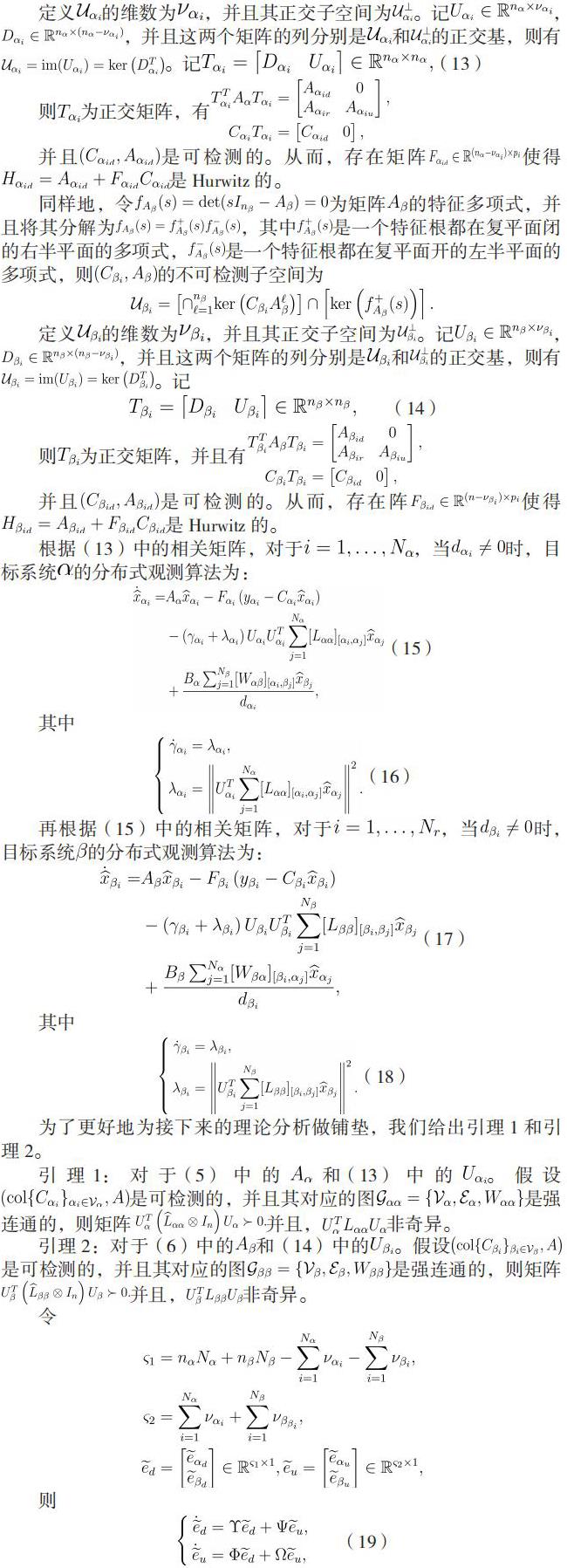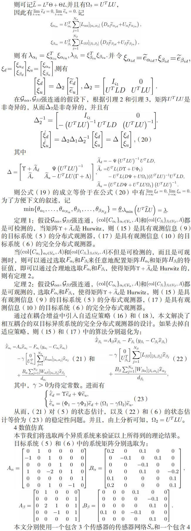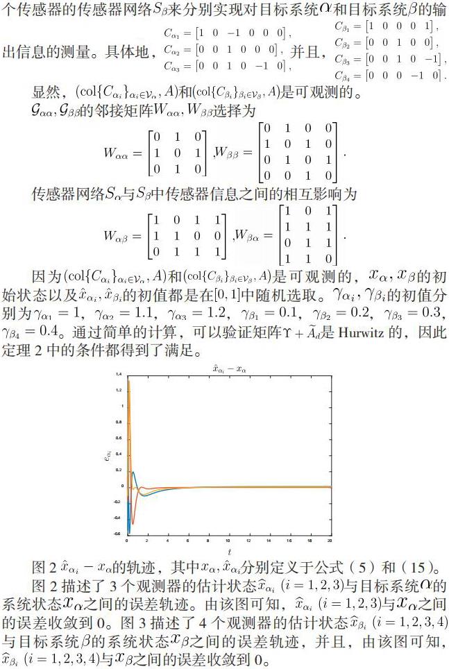 1) 对于相互耦合的两个异质并且维数不同的线性时不变目标系统,我们将用两组传感器网络来实现对两个目标系统的分布式观测其中每一个传感器只需测量该目标系统的一部分输出信息。每一个传感器将所获取的输出信息传递给其对应的观测器,以实现对其对应目标系统的完整状态的估计。