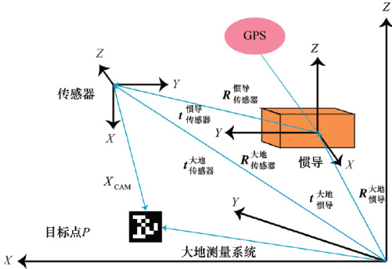 在机载测量系统中, GPS/IMU 联合定位系统可给载机提供世界地理参考系位置信息,利用 AprilTag 技术可以得到 AprilTag 对于传感器的 6 自由度姿态信息。摄像头及光学雷达与 GPS/IMU 之间的关系见图1。