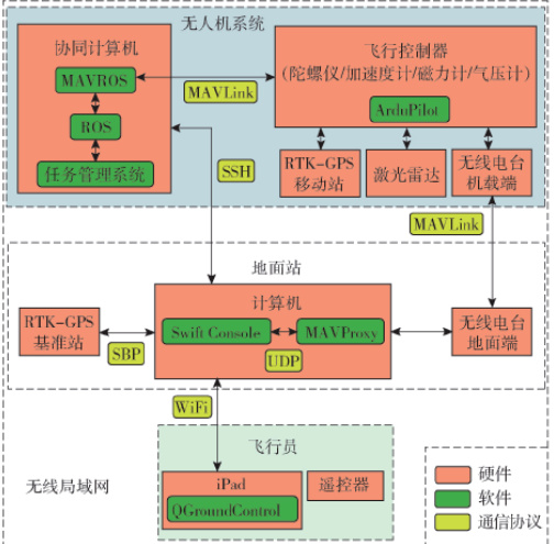 本文基于四旋翼小型无人机实现了由协同计算终端和开放飞行动力学系统构成的二层操纵系统,并采用 RTK-GPS 和激光雷达获得空中定位数据,按照 ROS、MAVROS 以及 MAVLink 通讯规范建立一套完整的无人机高精度自驾导航策略框架 ( 如图 2 所示 )。整体由地面设置 PiksiMultiRTK-GPS 基准点、 RFD900+ 无线收发器、轻薄笔记本的地面站,携带四旋翼无人机平台、Pixhawk 开源动力控制系统、RTKGPS 移动车载接收器、无线发射 / 接收装置、扫描激光器、协同处理器等其他配件的无人机系统和地勤人员监督并能够响应无人机飞行状态对必要的控制命令进行调控的地勤人员构成,他们通过QGround Control 软件对无人机进行远程控制并在必要时使用遥控器,这样当无人机转入自动驾驶模式后,若出现突发情况,能够马上转换为人工飞行控制方式[4]。