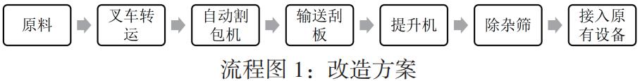 具体实施方案为,将自动投料设备通过刮板及提升机,通过除带丝设备后,直接接入现有投料口的输送设备中,从而保证整个生产线的原料使用需求。(详见流程图1)。