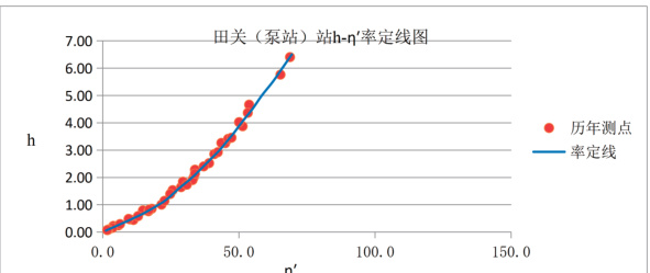 田关泵站建设的目的主要用于电机抽水排涝。田关(泵站)站于1990 年 12 月设立,隶属田关水文站。田关(泵站)站只收集流量资料,至 1998 年收集流量资料共 53 次,并采用效率法公式进行分析率定,通过三种检验和 t 检验,率定出历年综合线,并报当时领导机构批准使用,目前该线关系良好。