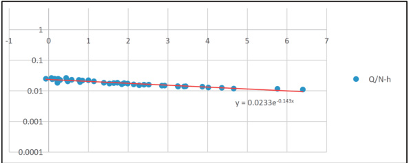 关系线,得出指数公式 y=0.0233e-0.143x , 按照公式 Q=ηkNe-εh 可得出 ηk 和 ε 对应值分别是 0.0233 和 0.143. 。
