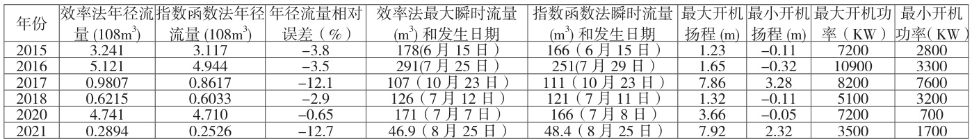 (1)指数函数法本对应的是低扬程的抽水站( 0-6m ),通过各年各要素的对比,虽各年误差多数已超 3% ,高扬程的年径流误差已超10% ,显然该方法不适用于高扬程抽水站。