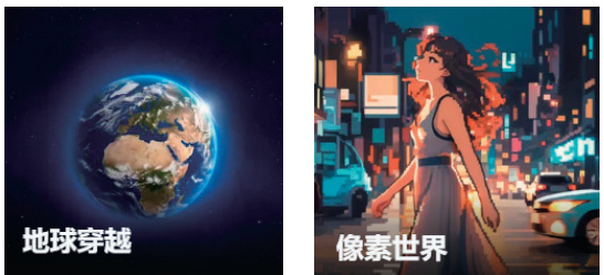 AI 图像生成技术能够基于输入的文本描述快速生成高质量的特效。在高级特效制作中,特效元素的设计与创建是基础且关键的环节。掌握这一技能,意味着特效制作人员可以借助如 StableDiffusion、runway、可灵等 AI 图像生成工具,根据创意构思迅速产出独特的特效元素,如奇幻生物、神秘场景等。例如在可灵AI 中的创意特效板块,有及其生动的创意特效生成案例——“地球穿越”、“像素世界”、“一键3D 拍立得”等,可以直接提供给AI 一张图片,生成属于你的风格特效,如图 2.1 所示。为特效制作节省大量的时间和人力成本,同时还能激发更多创意灵感。