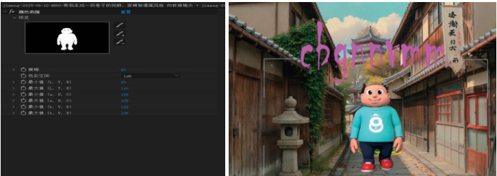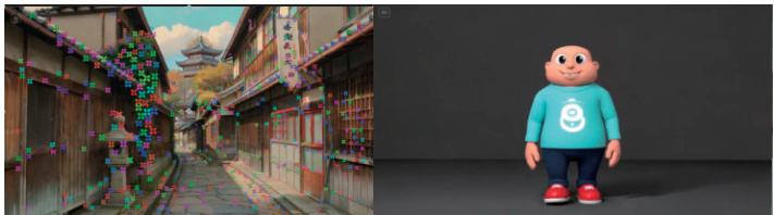 除了在传统的影视特效制作中发挥重要作用外,人工智能技术还能为影视特效的再创作提供有力支撑。通过对生成的场景和模型进行再编辑,能够再创作出新的特效效果,为影视作品注入新的活力和创意。这种再创作的方式,不仅丰富了影视作品的视觉效果,还为观众带来了更为新颖和独特的观影体验。例如,在可灵 AI 中生成一段卡通风格的场景视频,生成一个 3D 卡通角色模型,导入到 AE 软件中进行编辑,如图 3.1 所示。第一步导入场景素材,创建“3D CameraTracker”3D 摄像机跟踪器,如图 1 所示。第二步选择跟踪点并创建三维元素。在合成窗口中,选择颜色范围对卡通角色进行背景的抠像。其次选择一组合适的跟踪点,把三维模型导入到编辑器窗口,修改模型中心点为脚部,并且打开3D 开关;在原视频层上创建空白跟踪点,把空对象的位置信息复制粘贴给三维元素层;使用位置、缩放和旋转工具,调整三维元素的位置和大小,使其在场景中看起来自然,播放看其效果,如图 3.2 所示。第三步在合成中添加一些文字效果。选择合适的跟踪点,鼠标右键创建文本,使用文本工具输入文字,打开3D 开关;把文本的位置信息,复制到文字图层上,使用位置、缩放和旋转工具,调整三维元素的位置和大小,使其在场景中看起来自然。