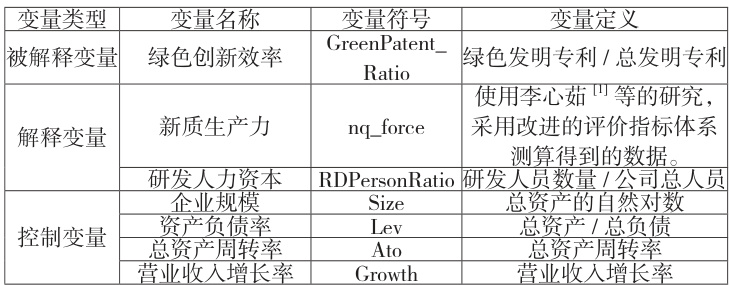 在本文的研究中,选取新质生产力和研发人力资本作为解释变量。新质生产力(nq_force)采用李心茹等 ⌊19⌋ (2024)改进的评价指标体系测算得到的数据,代表以创新为主导的先进生产力。新质生产力本质上注重高质量和可持续发展,因此可能直接促进绿色技术创新。研发人力资本(RDPersonRatio),是创新投入的核心代理变量,直接反映企业对研发活动的重视程度。人力资源是技术创新的基础,高比例的研发人员通常意味着更强的创新潜力。本研究中用研发人员数量与公司总人员数量的比率计算这一变量。