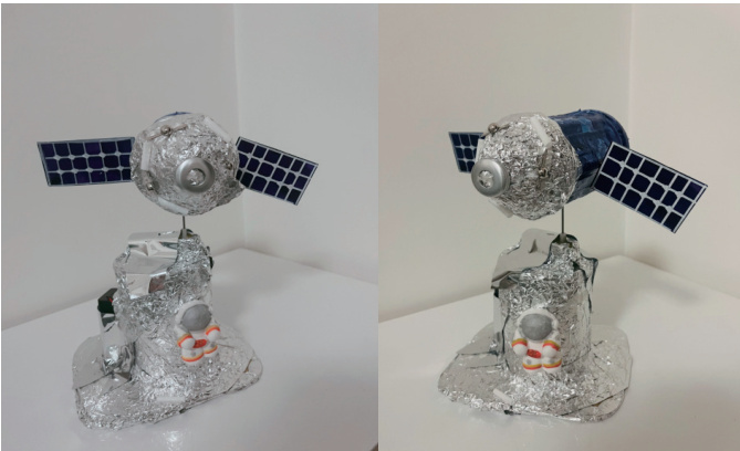 学生的航天器作品展现了丰富的想象力和创造力。例如,一组学生用矿泉水瓶和锡纸制作了极具未来感的“星际飞船”,另一组用蛋托和超轻粘土精细还原了“天宫空间站”的多个舱段。艺术元素的融入,使科技制作不再是冰冷的技术重复,而成为了情感和思想的表达载体,完美体现了STEAM 中“A”的价值。