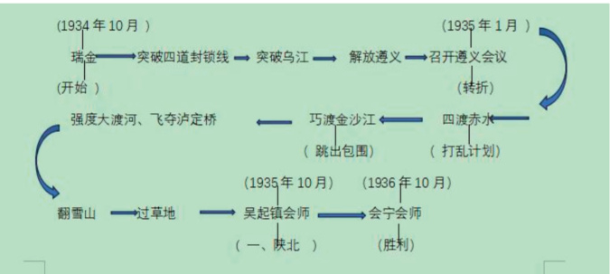 瑞金出发 ----- 突破四道封锁线一突破乌江 - 解放遵义 --- 召开遵义会议 -- 四渡赤水 -- 巧渡金沙江 ---- 强渡大渡河、飞夺泸定桥-- 翻雪山过草地---- 吴起镇会师一 - 会宁会师
