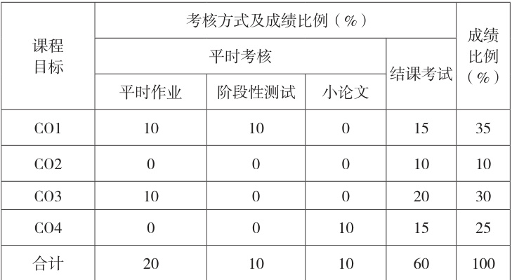 考核方式与课程目标的对应关系:项目组精心设计了考核环节对课程目标的支撑矩阵,如下表所示。这种设计确保了每一个课程目标都有至少两个考核环节予以支撑,评价结果更为可靠,并能从不同侧面反映学生的能力水平。