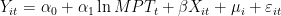 其中, Yit 为银 i 在 t 期的盈利指标, lnMPTt 为移动支付交易规模的对数, Xit 为控制变量矩阵, μi 为个体固定效应, εit 为随机误差项。