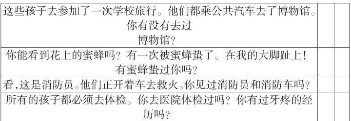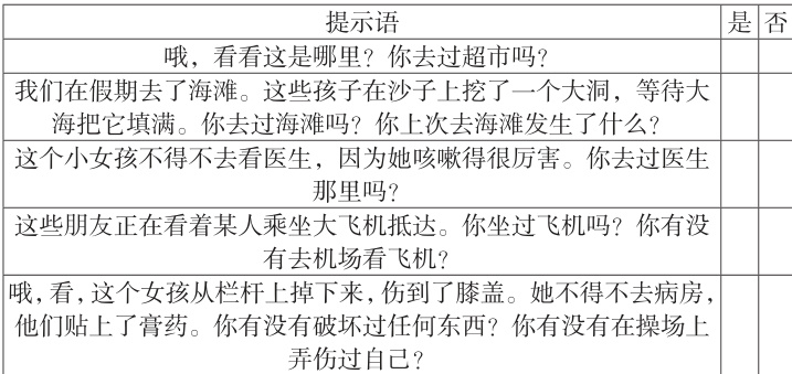 个人叙述法依托Peterson 和McCabe(1983)提出的对话地图技术。研究者使用口袋大小的相册,通过照片引导儿童分享个人经历。例如问:“你曾经发生过类似的事情吗?”若回答“是”,则继续追问“你能告诉我吗?”并配合中性提示(如“嗯”“告诉我更多”)鼓励表达;若回答“没有”,则翻至下一张照片。该方法的核心在于通过情境化的视觉刺激,激发儿童自发表达,帮助其回忆和叙述生活经验,从而引出更多话语,便于评估语言发展水平。为了引出孩子更多的话语。以下表格是对话地图技术中评估者的提示语示范案例。