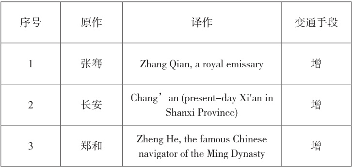 正如“增”这一手段的定义所示,序号 1 至 3 均在后文中接以逗号和括号进行信息标注和补充。译文后方补充信息“a royal emissary”、“the famous Chinese navigator of the Ming Dynasty”、“present-day Xi’anin Shanxi Province”作为同位语,采用“增”这一变通手段还原信息量,并结合中国文化背景以适当补充,从而展现了灵活性,达到了兼顾读者理解与原文表达的目的,有助于促进海外读者对中国文化的理解。