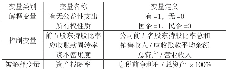 本文共设计了企业所有权性质、前五股东持股比率,应收账款周转率,资产密集度为控制变量,分别代表公司的权属性质、治理能力、运营能力。将这几个变量导入回归模型中,使模型更能精确的反映出企业进行公益救助对绩效产生的影响。