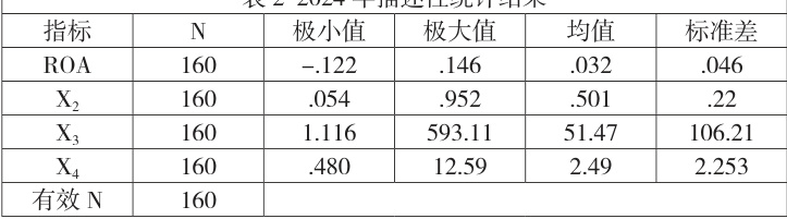 本文首先对研究样本的近三年(2022-2024)数据进行描述性统计,介于篇幅所限仅以 2024 年为代表进行展示,具体见表 2。160 家样本企业 ROA 三年的平均数值分别为 5.1% , 0.7% 以及 1.2% ,其中 2022年整个市场受疫情冲击比较严重,国民财富大幅缩水影响,经济下行,企业的 ROA 表现整体不佳。 大股东持股比率以及前五股东持股比率未出现较大波动,公司整体架构和治理结构变化不大。应收账款周转率受个别企业极大值过大所致,波动明显。资本密集度同样上升,营运能力同样在2022 年明显较差,2023 年略回升。