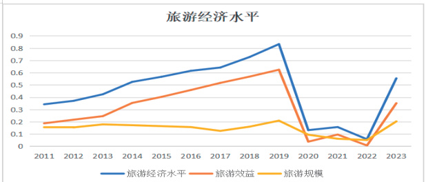 如上图 2 所示,2011 年至 2019 年旅游经济水平从 0.34 上升至 0.83增长率达到了 144.11% ,反映了国内旅游市场的不断扩大。在 2019至 2022 年疫情期间,因消费者出行不便以及考虑健康安全等原因,旅游经济水平受到较大影响。2023 年,旅游规模较 2022 年有较明显的增长,表明旅游市场供给能力不断增强。这些现象都能够表明,旅游经济的水平正在朝着较好的态势发展,然而,旅游经济在发展过程中也面临着一些挑战,如市场波动、基础设施建设不足等。未来,旅游经济需要继续推进产品创新、服务升级和区域协调发展,进一步提升旅游经济的整体水平。