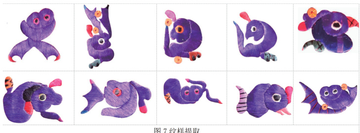 从台江县方南支系苗族服饰的臂绣部位,选取那些形态呈现出抽象特征的动物纹样来开展深化设计方面的工作。以下是提取的纹样: