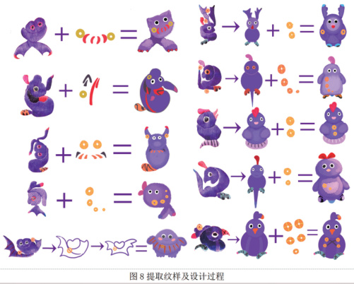 本研究以台江县方南支系苗族动物纹样为元素,进行“南”怪萌包的设计,台江县方南支系苗族是苗族文化的代表类型之一,它所蕴含的丰富视觉元素以及深厚的历史内涵,为文创玩偶包包的设计方面提供了极为宝贵的资源。色彩饱和度颇高的传统色彩,带有浓厚文化内涵。其中涵盖了充满着蓬勃生机的动物图案,并且这些纹样带着怪诞抽象的艺术审美,以此作为“南”怪萌包的设计形象,与当代追求丑萌、怪诞的猎奇心理不谋而合。