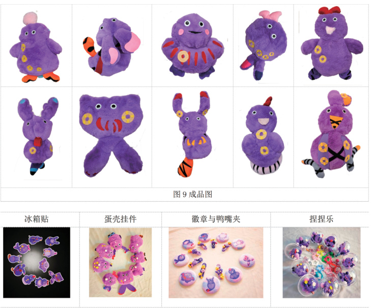 设计稿中,玩偶包包保留原纹样抽象怪诞的特色形态,只进行原纹样立体化设计,不过多进行深化设计,保留怪诞可爱的形象;在颜色上也进行了纹样原色保留,保留纹样上的传统色;针对玩偶包包的样式进行了双肩的设计更适用于儿童人群的定位。
