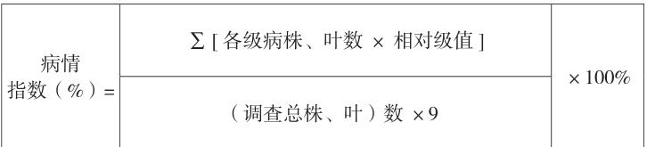 于第四次施药后第 14 天病害基本稳定时,采取棋盘式取样法,每小区调查 10 点,每点调查 5 株,每小区共查 50 株,分级记录发病情况,与空白对照相比,计算病情指数和防治效果,计算方法 [2] [3]: