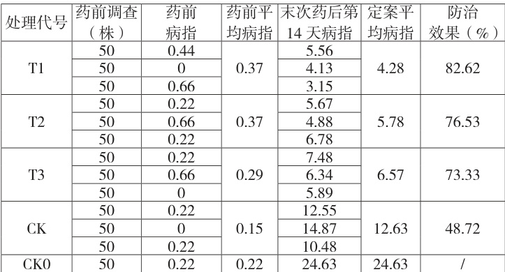 (1)有关气象影响因子:试验期间以晴阴天气为主,四次施药后7 天期间仅第 1 天出现有小到中雨,无大到暴雨等气象影响因子,对试验结果影响不大,