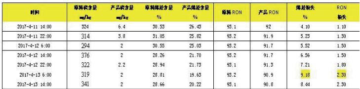 Πn 降烯烃测试欲将汽油烯烃降低10 个单位(从 27%~28% (V/V)降到 17%~18% (V/V),需在安全平稳的前提下,兼顾对 ME101差压升高的影响,不再考虑辛烷值损失、氢耗、轻液收、吸附剂消耗,摸索出