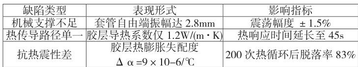 这种连接方式在常温静态条件下虽能满足基本定位需求,但在实际流化床动态工况中暴露出问题如表 1 所示,其中力学支撑失稳现象尤为突出。当床层内钛渣颗粒以 3-5m/s 的速度持续冲击测温元件时,悬臂结构末端产生周期性的挠曲振动。原结构中的陶瓷胶层虽然具有优良的绝缘性能(体积电阻率 >1014Ω⋅cm ),但其导热系数仅有1.2W/(m⋅K) ,显著低于金属套管(14.3W/(m·K))。这导致温度信号传递过程形成”热阻 - 容滞后链”。通过高温显微观察发现经历 200次 850°C200°C 热循环后,胶层出现明显龟裂现象,裂缝密度达到 2条 /mm2 , 造成约 23% 的有效接触面积损失。