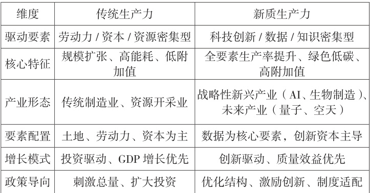 新质生产力与传统生产力并非简单的替代关系,而是呈现对立统一、替代与共生并存的复杂互动,从驱动要素、核心特征、产业形态、要素配置、增长模式以及政策导向方面,两者有着极大的区别,具体见表1 所示: