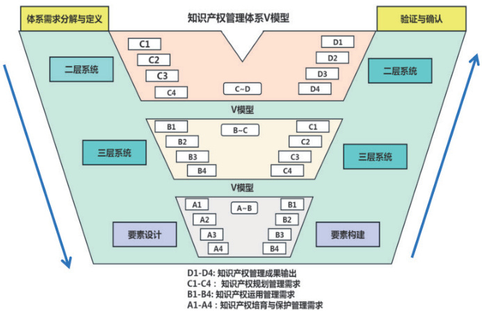 本文研究的基于 MBSE 的核领域知识产权管理体系包括知识产权规划管理层、知识产权培育与保护管理层、知识产权运用管理层等三个层次,正向流程设置为从知识产权战略目标分解至专利挖掘、布局实施、维权保护、转化运用等操作层任务,逆向验证设置为通过监测