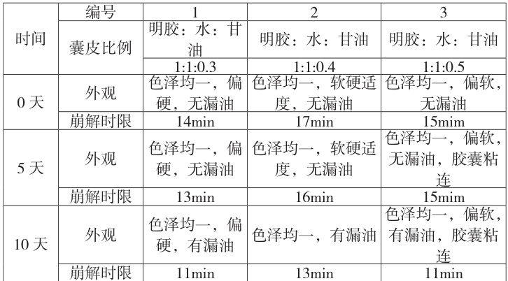 上述试验结果显示,试验 1 崩解时限符合药典要求,放置 10 天后观察有漏油现象;试验 2 崩解时限符合药典要求,放置 10 天后手摸手感软硬适度,无漏油现象;试验 3 崩解时限符合药典要求,放置 10天后手摸手感偏软,无漏油现象,胶囊发生轻微粘连。