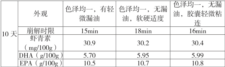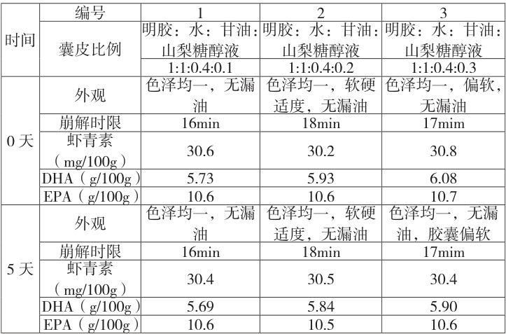 调配囊皮配方中明胶:水:甘油比例为 1:1:0.4,调整山梨糖醇液的比例,筛选并确定软胶囊囊皮配比。将囊皮分别按照以下配方比例:(1)明胶:水:甘油:山梨糖醇液 τ=1:1:0.4:0.1 、(2)明胶:水:甘油:山梨糖醇液 =1:1:0.4:0.2 、(3)明胶:水:甘油:山梨糖醇液=1:1:0.4:0.3 ,按流程压丸、干燥(已含定型)制成软胶囊。将制成的软胶囊放置在温度 26°C 、湿度 45% 条件下,分别于 0 天、5 天、10天取样检测,以胶囊外观、崩解时限、虾青素、DHA、EPA 含量为指标,评价胶囊皮配比情况及胶囊皮和内容物的相互影响情况。