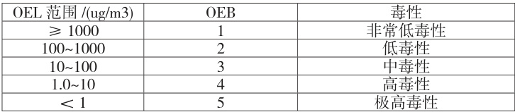 通过职业暴露限值(OEL)与职业暴露等级(OEB)来进行评估风险:OEL 是指劳动者在生产作业 8h 的时间加权平均容许接触浓度,直接反映了药物的毒性强度 [3]。OEB 是根据 OEL 值对毒性药品的职业暴露风险进行分级,如表1 所示。
