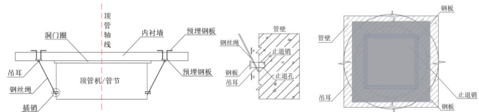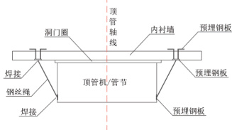 早期针对小断面圆形顶管,传统方案在顶管周围的始发井墙壁上以及顶管管节处分别设置预埋钢板,当油缸行程顶完管节到位后、千斤顶油缸回缩之前,为了避免出现顶管机及管节回退现象,采用一根钢绳将始发井井壁与管节进行连接,钢绳一端端头与始发井墙壁上的预埋钢板进行焊接连接,钢绳另一端端头与管节上的预埋钢板进行焊接连接,依靠焊缝之间的抗剪强度来抵抗回退力,使得始发井井壁与管节连接成为一个整体,保证顶管机与管节的稳定。每投入一节管片就需要钢绳焊接加固一次,开始管片顶进后再将钢绳切割,依次重复上述流程,直至完成整个管片的施工。钢绳焊接止退装置详图见图1。