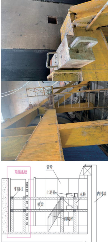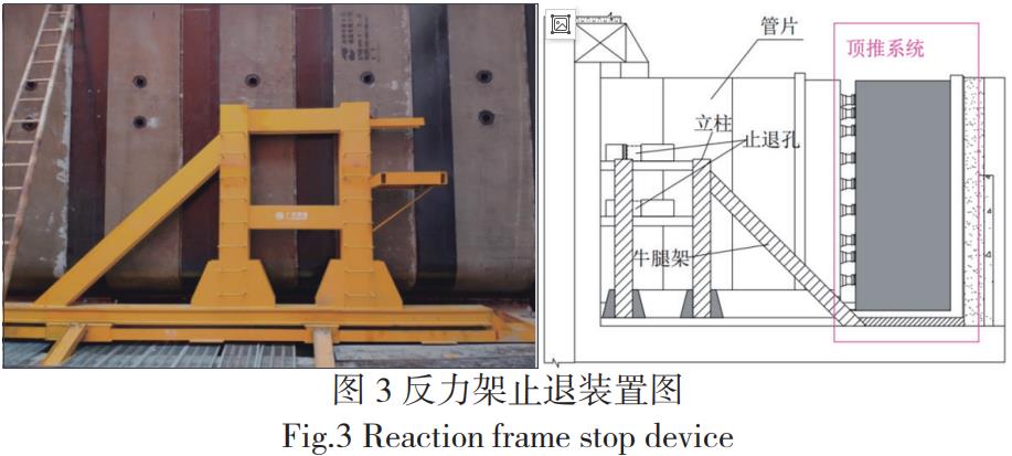 为了解决更大断面圆形顶管止退的问题,舍弃传统上钢绳组成的止退装置,采用反力架止退装置。在始发井管节两侧外各安装一套止退装置,包括型钢、牛腿架。当油缸行程推完,安装管节的时候,将插销插入管节外壁的吊装孔或者止退孔。管节的后退力通过插销、销座传递到止退装置的后支柱上,止退装置和基座焊接在一起,把顶管机和管节稳住,已达到止退效果。反力架止退装置图见图3。