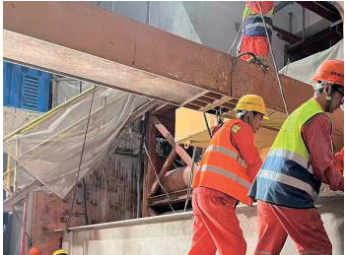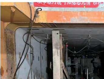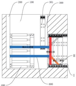 新型止退装置对于大多数超大断面矩形顶管或者覆土超深、超大断面矩形顶管施工,均能够达到有效止退的效果,但对于一些非常特殊情况下的顶管施工时,也会出现止退失效的时候,例如由于施工作业区域受限,顶管施工时的履带吊行驶作业范围刚好位于顶管顶进路线正上方,使得原本已经超大的正面水土压力又进一步剧增,这种情况下,新型止退装置的后靠墙能够承受如此大的回退力,但型钢的抗压强度可能承受不住,会出现型钢变形、止退失效,甚至插销承受的回退力会将管节外壁止退孔崩坏,造成管节的损坏。