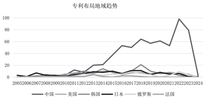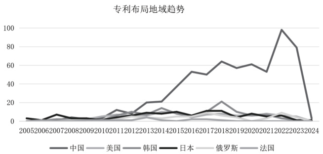 专利布局地域即为专利保护区域、主要市场国,以及专利的集聚区。专利布局多的地区,既是主要的市场销售国也是专利布局保护最为严密的地区,还是相关专利法较为完善的地区。将专利布局与时间趋势联系起来,也能体现专利布局随时间的变化趋势。图 1 中展示了在中国、美国、法国、韩国、俄罗斯、日本这几个主要专利布局市场国的年代申请趋势。其中,在中国布局的专利数量在近十年间出现了明显的增长趋势,由年申请 20 余件一跃达到近百件;而其他国家的年度布局趋势较为平稳,基本维持在 10 件以内。结合整体发展态势可以研判,无论是中国还是国外的创新主体,仍在核燃料性能领域持续开展专利布局工作。