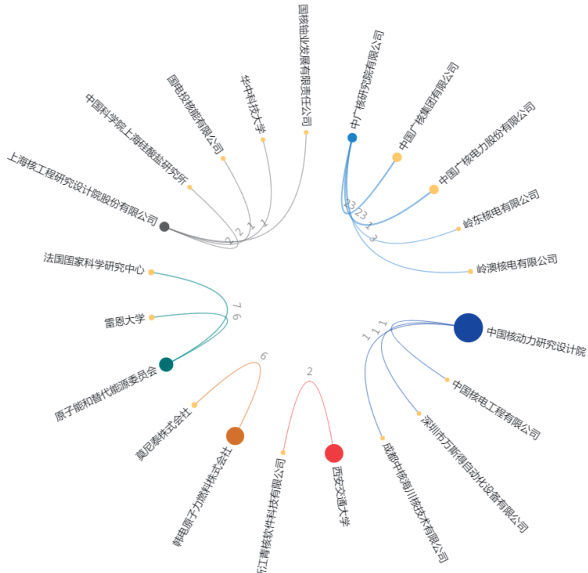 合作申请专利的主体多为科研院所 + 科技公司或科研院所 + 高校的形式,体现出产学研协同联动的合作模式。其中,中广核研究院有限公司分别与同属中广核集团的岭东核电有限公司、岭澳核电有限公司等合作开展燃料棒包壳完整性监测及蠕变性能分析、格架氧化膜检测等关键技术研究。上海核工程研究设计院分别与国电投核能有限公司、国核铀业发展有限责任公司、华中科技大学等合作开展燃料组件模型计算、用于安全检测的模拟燃料组件、包壳管表面热辐射信号测试等研究。西安交通大学与浙江青核软件科技有限公司合作开展了燃料棒表面临界热流密度实验研究、燃料棒弯曲热工水力性能研究等。中国核动力研究设计院分别与中国核电工程有限公司、深圳市万斯得自动化设备有限公司、成都中核海川核技术有限公司合作开展核燃料化工反应器用材料腐蚀试验、燃料包壳管双轴蠕变测试、燃料组件破损在线检测等研究。