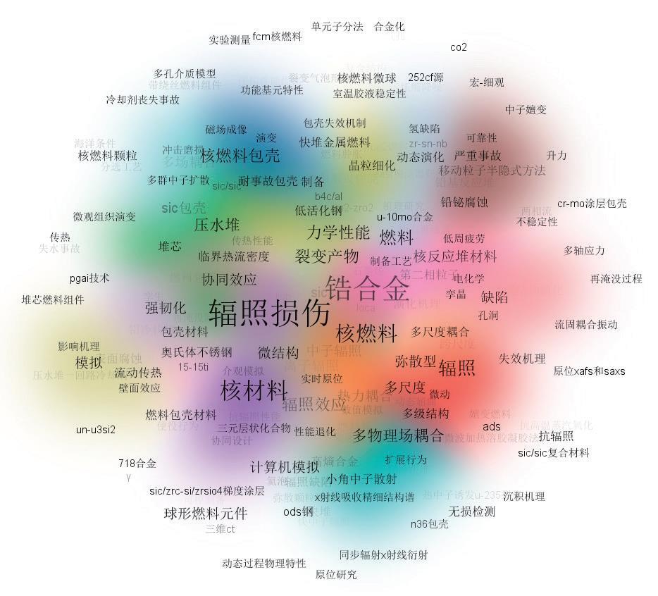 通过分析全部基金项目的关键词可知,涉及燃料辐照损伤性能研究的项目最多,且针对锆合金的性能研究或是多物理场多尺度耦合下的燃料性能研究,也是各项目主体关注的重点。