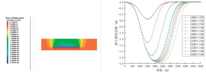 根据提取数据绘制地表沉降曲线及位移云图(图 6(a) )可知,在工作面走向方向一次性开挖 1000m , 倾向开挖 370m 和 740m 时,地表均出现明显沉降,沉降曲线图呈“V”型;倾向开挖 740m ,走向开挖 1700m 开始逐渐细化开挖距离,分别开挖 1700m 、 1800m 、 1850m 、