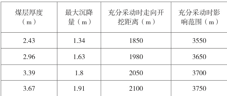 由式(1)得,当二1 煤层开采厚度为 2.43m 时,下沉系数为0.55;开采厚度为 2.96m 时,下沉系数为 0.55;开采厚度为 3.39m 时,下沉系数为0.53;开采厚度为 3.67m 时,下沉系数为 0.52 。