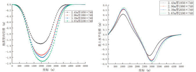 根据模拟结果可得到四个煤层厚度分别达到充分采动时的沉降曲线,再对该曲线对应的水平位移通过数值模拟进行检测,可得到当煤层达到充分采动时该厚度的水平位移曲线,如图7。