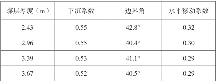 由式(3)得,当二 1 煤层开采厚度为 2.43m 时,水平移动系数为 0.32;二 1 煤层开采厚度为 2.96m 时,水平移动系数为 0.31;二 1煤层开采厚度为 3.39m 时,水平移动系数为 0.29;二 1 煤层开采厚度为 3.67m 时,水平移动系数为 0.29 。有数据可知,随着煤层厚度增加,地表下沉系数、边界角和水平移动系数总体呈下降趋势。