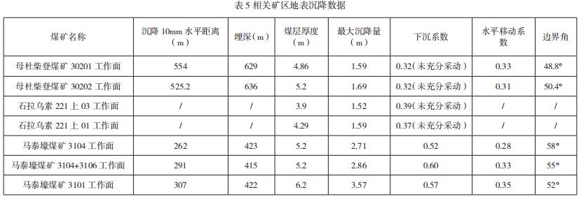 由于本矿井为基建矿井,尚未开采,暂无法进行现场实测,为验证数值计算的准确性,收集了距该井田附近母杜柴登煤矿、石拉乌素煤矿相关文献地表沉降数据,以及马泰壕煤矿 3104、3106 工作面地表移动监测研究报告相关数据,并依据已知数据和公式(1)、(2)和(3)进行下沉系数、水平位移系数和边界角的计算。