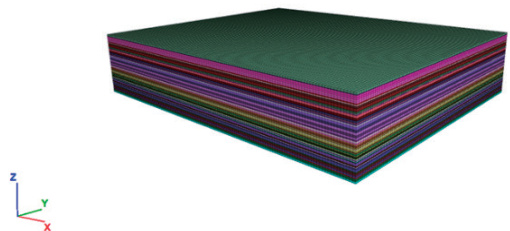 根 据 该 矿 工 作 面 情 况, 基 于 FLAC3D 平 台 建 立 尺 寸 为5000m×4000m×1020m 的模型(如图 3),在竖直方向,底部距离三 1 煤层 210m ,上部建模至地面。开挖尺寸长 × 宽分别为1000m×370m 、 1500m×740m 、 2000m×740m 、 2500m×740m ,并在此基础上进一步细化并找到达到充分采动时的开挖尺寸。开挖位置为模型中部,距离模型左侧边缘 1000m 。本次模拟地层倾角设置为水平,将埋深设定在 740.60m 。