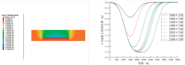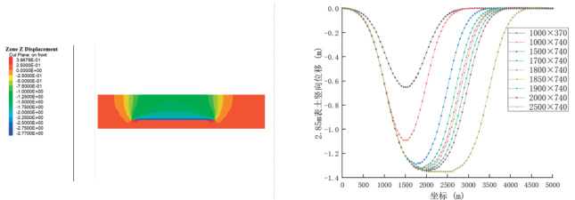 根据提取数据绘制地表沉降曲线及位移云图(图 6(c))可知,当走向开挖至 1600m ,倾向开挖 740m 时,曲线底部逐渐平缓;从走向开挖 1900m 开始逐渐细化开挖距离,经过走向开挖 1900m 、 2000m 、2050m 、 2100m 后发现,当开挖 2050m ,倾向开挖 740m 时,沉降曲线出现“盆底”形状,表明地表沉降在走向方向开始处于充分采动;当开挖 2100m ,倾向开挖 740m 时,沉降量曲线形成较明显的“盆底”形状,表明地表已处于超充分采动,因此认为当走向开挖 2050m ,倾向开挖 740m 时,在走向方向上刚好达到充分采动,此时最大下沉量1.8m ,地表下沉 10mm 时影响范围为 3700m 。
