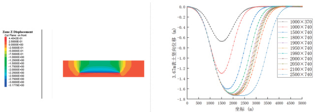 根据提取数据绘制地表沉降曲线及位移云图(图 6(b))可知,当走向开挖至 1500m ,倾向开挖 740m 时,曲线底部逐渐平缓;从走向开挖 1800m 开始逐渐细化开挖距离,经过走向开挖 1800m 、 1900m 、1950m 、 1980m 、 2000m 、 2050m 、 2010m 后发现,当开挖 1980m ,倾向开挖 740m 时,沉降曲线出现“盆底”形状,表明地表沉降在走向方向开始处于充分采动;当开挖 2000m ,倾向开挖 740m 时,沉降量曲线形成较明显的“盆底”形状,表明地表已处于超充分采动,因此认为当走向开挖 1980m ,倾向开挖 740m 时,在走向方向上刚好达到充分采动,此时最大下沉量 1.63m ,地表下沉 10mm 时影响范围为3650m 。